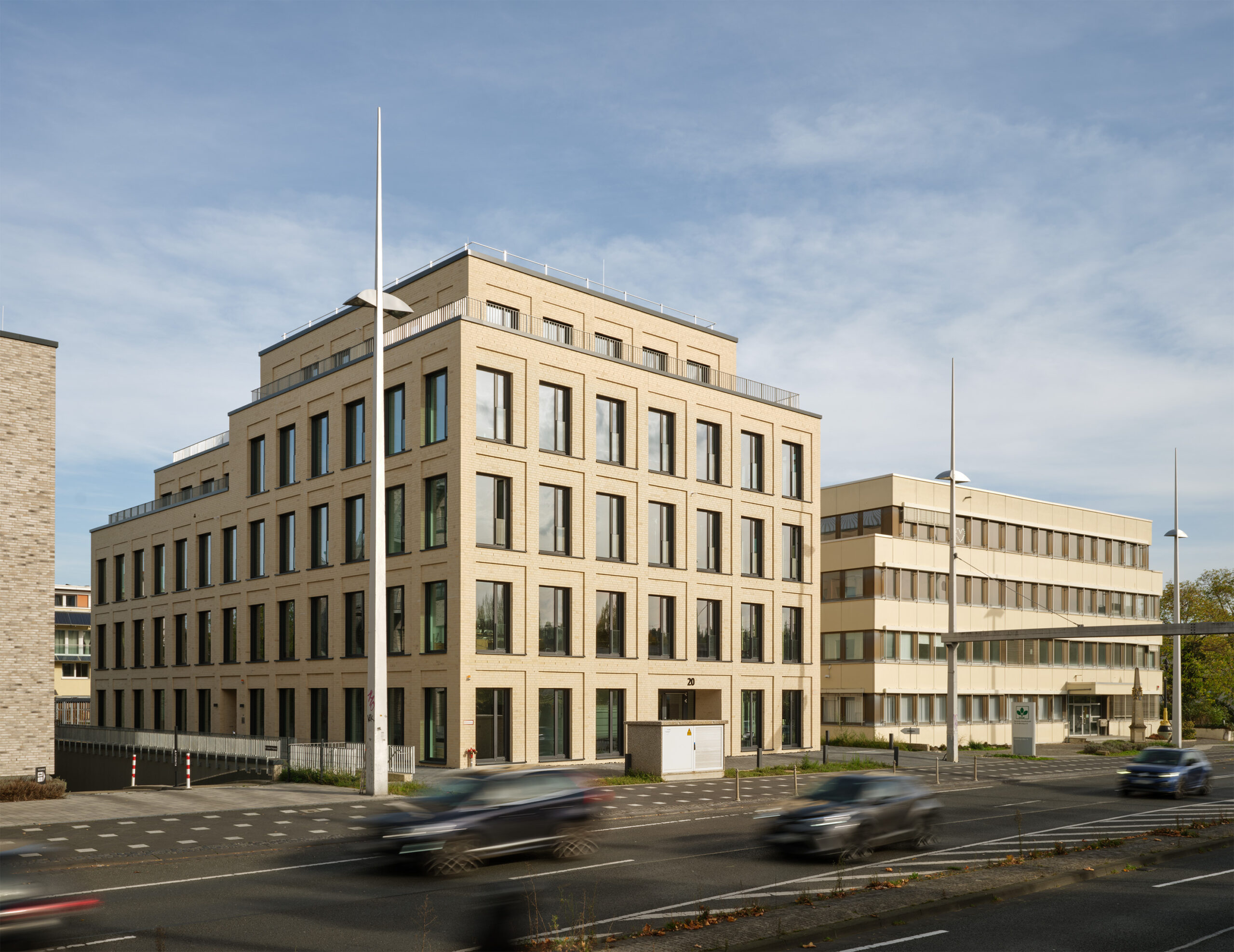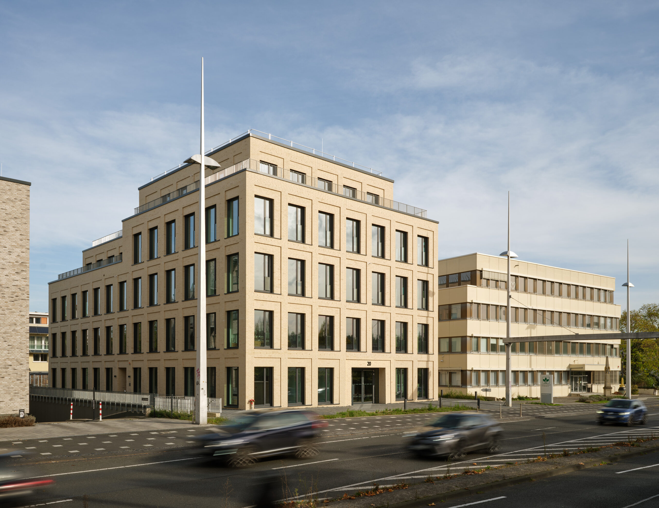 Neubau eines repräsentativen Bürogebäudes im Bonner Stadtteil Bad Godesberg. Die stark befahrene, vierspurige Godesberger Allee stellt jeden Architekturfotografen vor eine Herausforderung, wenn es darum geht, einen geeigneten Standpunkt für die Aufnahmen zu finden. Häufig steckt der Teufel bei der Architekturfotografie aber auch im Detail. Damit störende Objekte – in diesem Fall ein großes Trafohäuschen vor der Gebäudefront – in der Bildbearbeitung entfernt werden können, muss bereits beim Shooting darauf geachtet werden, genügend Bildmaterial aus zusätzlichen Perspektiven zu erstellen.